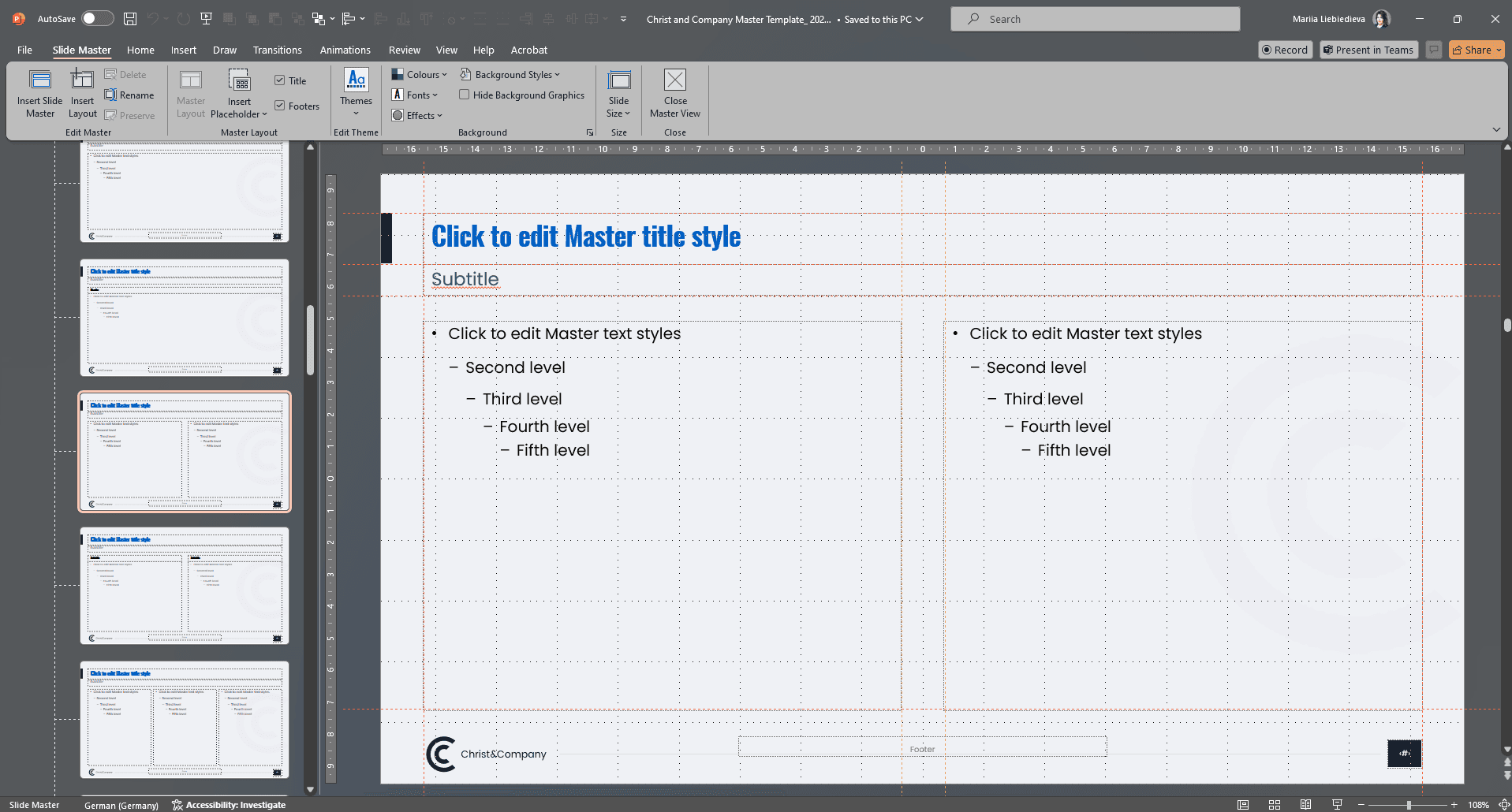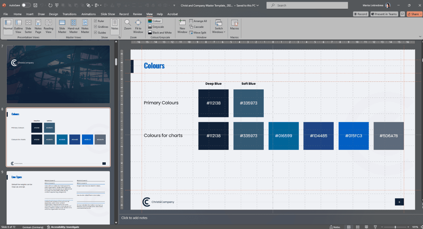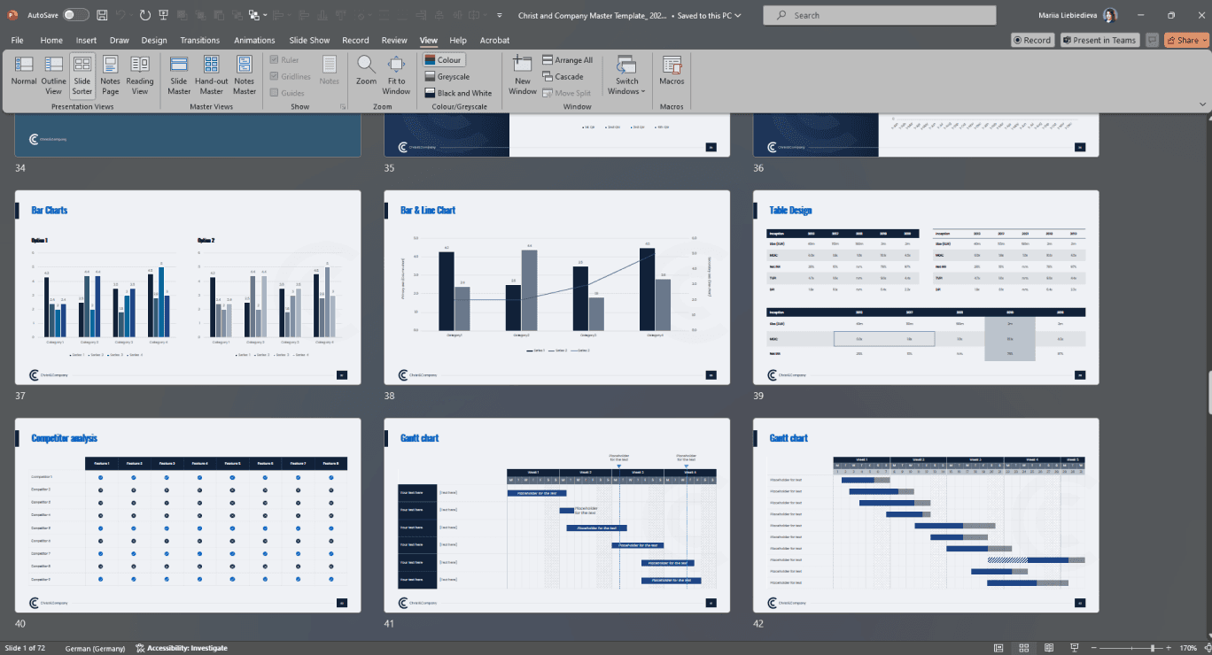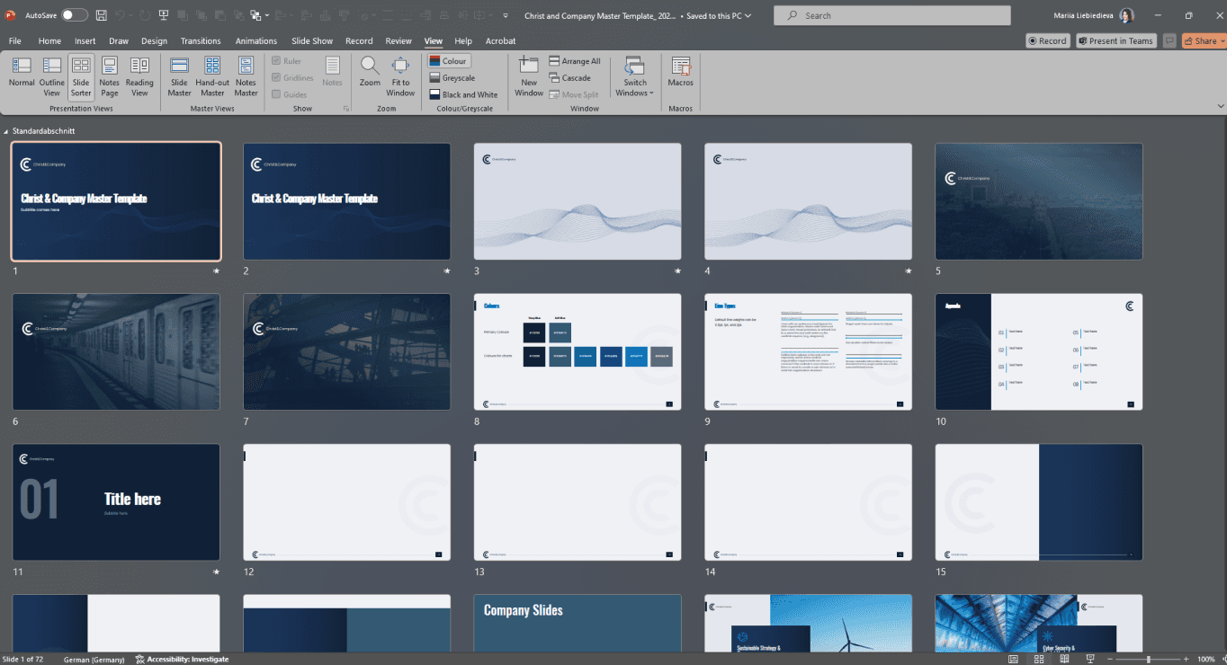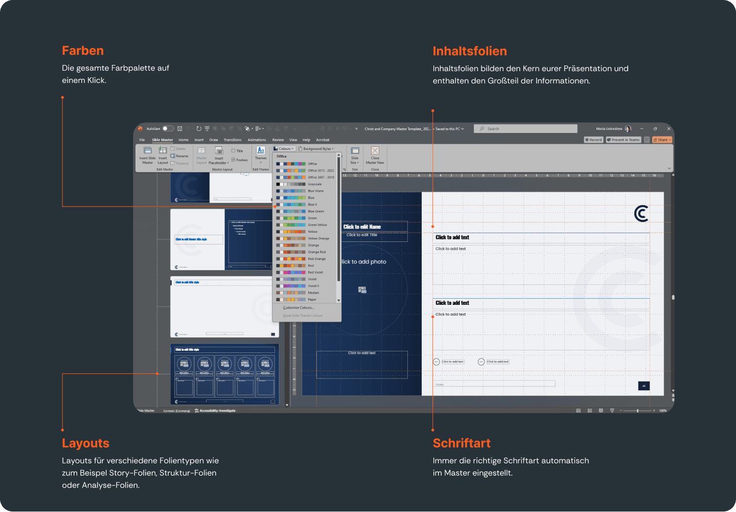 The master contains all relevant presets such as fonts, colors, layout, and design of a company. As a result, the recognition value increases, and the presentations gain professionalism.