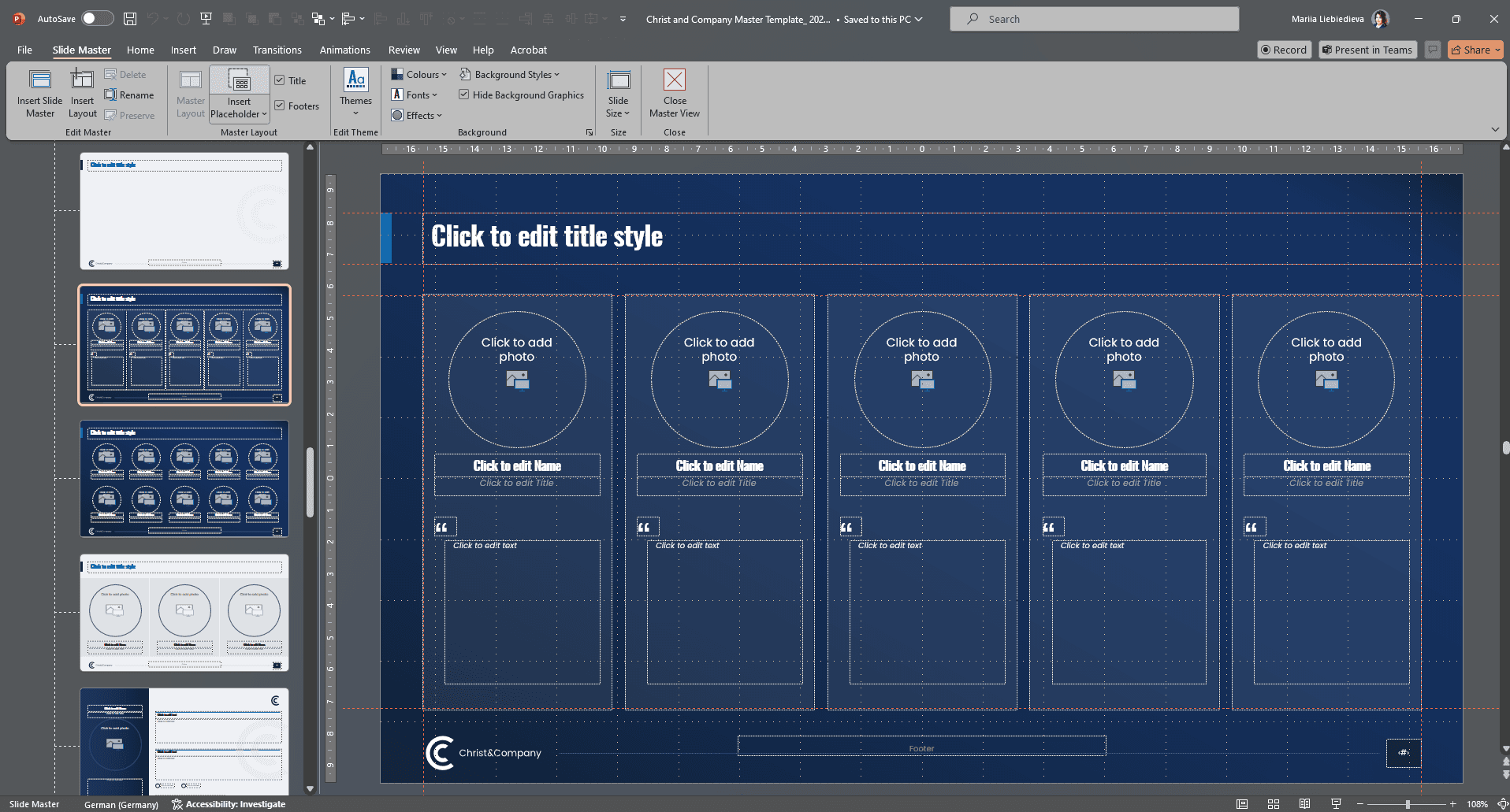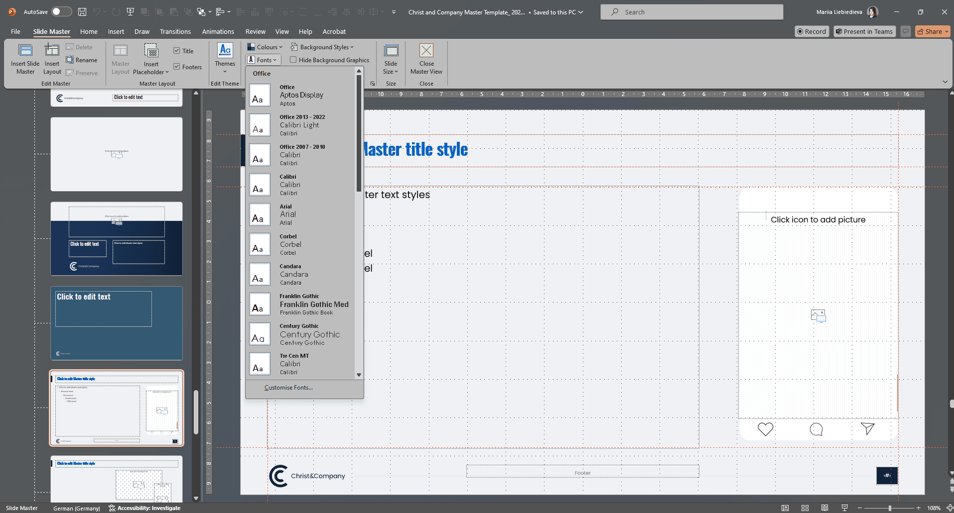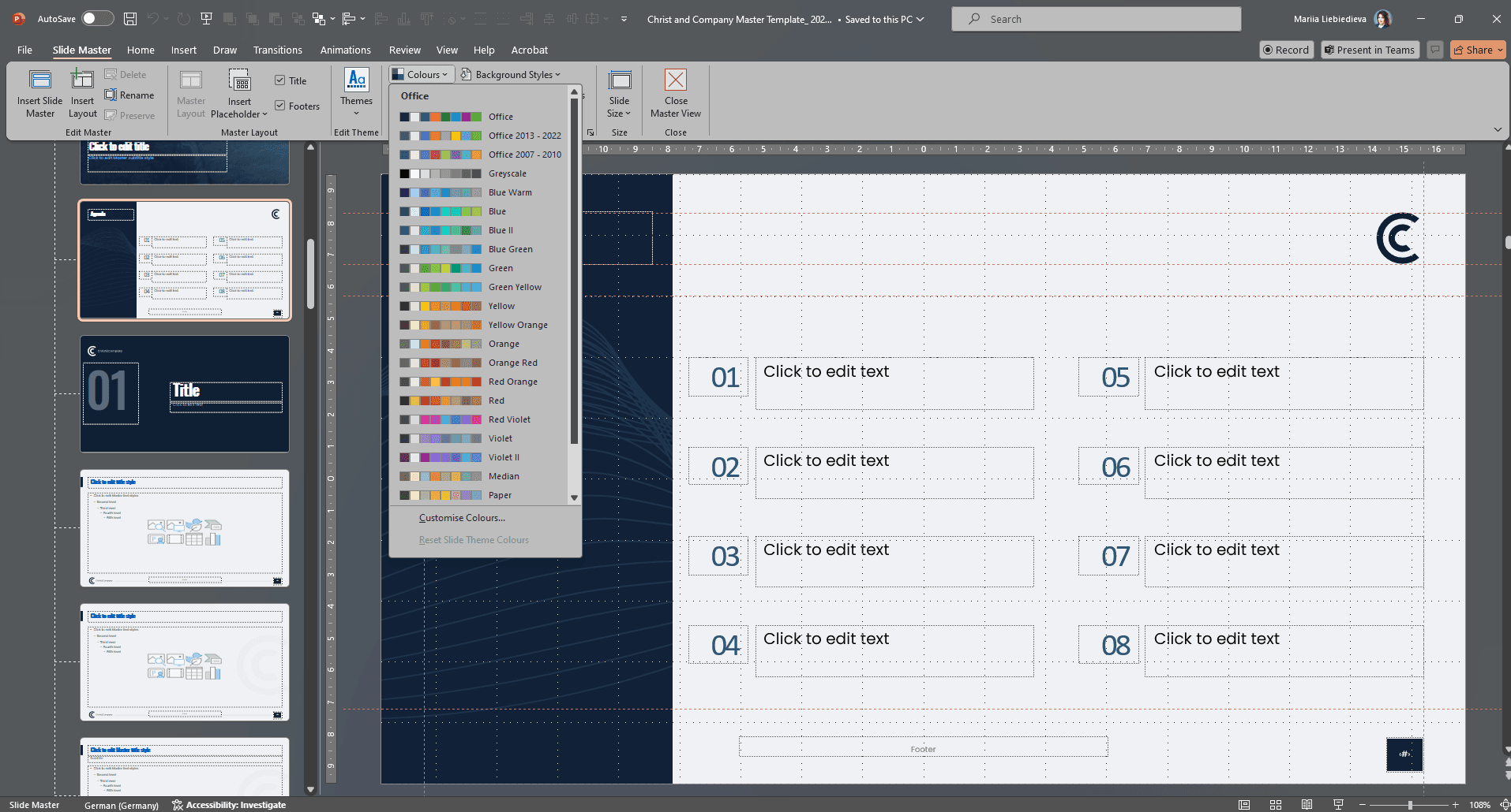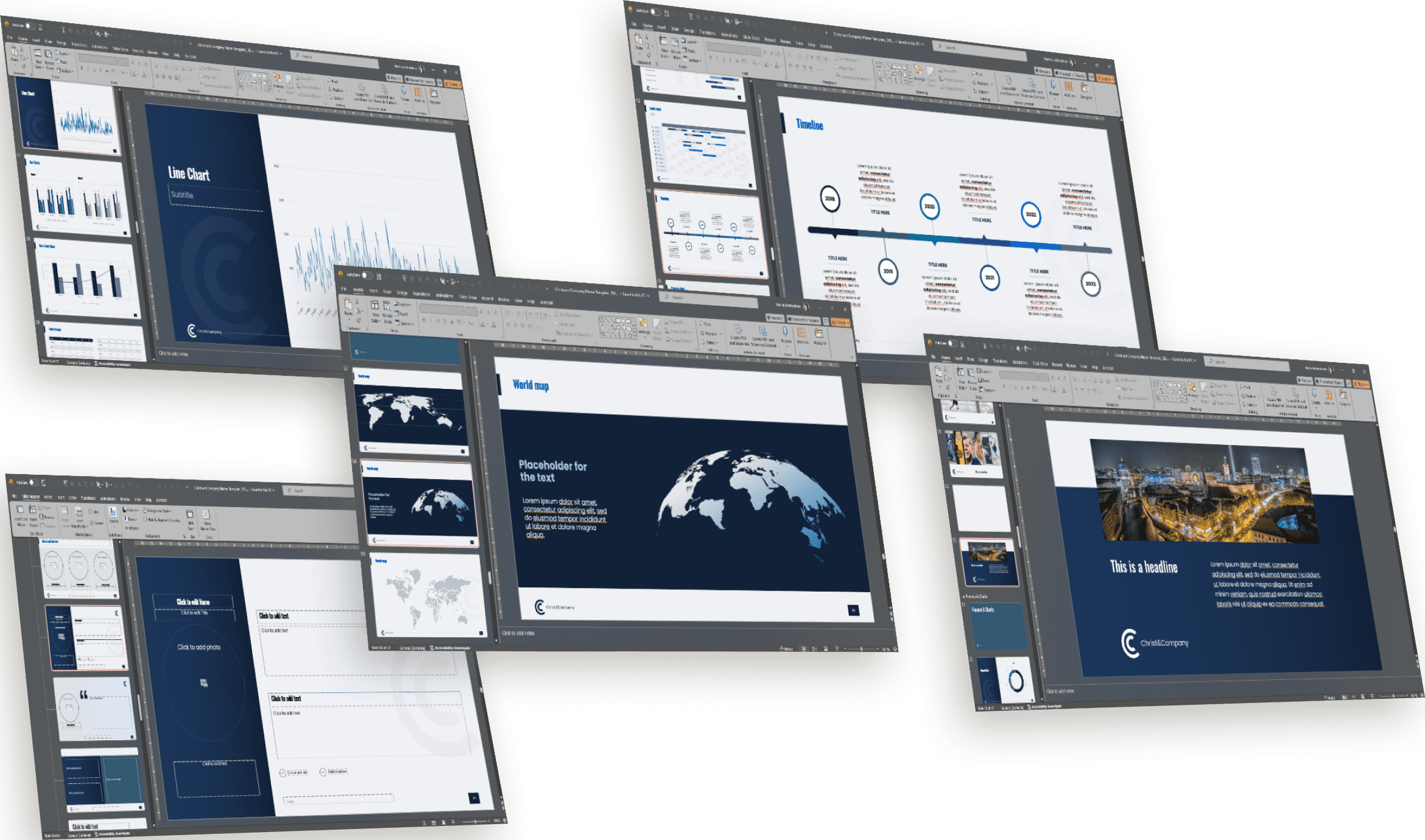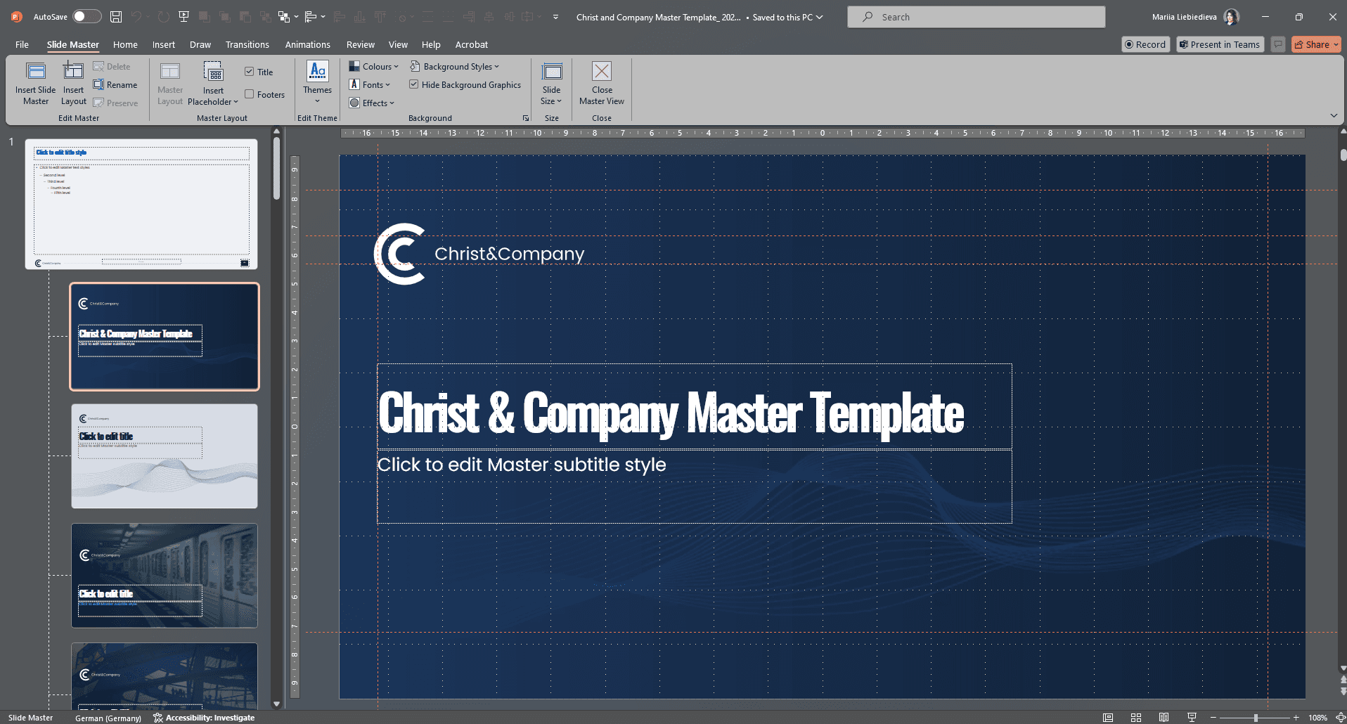 The master contains all relevant presets such as fonts, colors, layout, and design of a company. As a result, the recognition value increases, and the presentations gain professionalism.