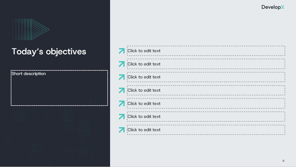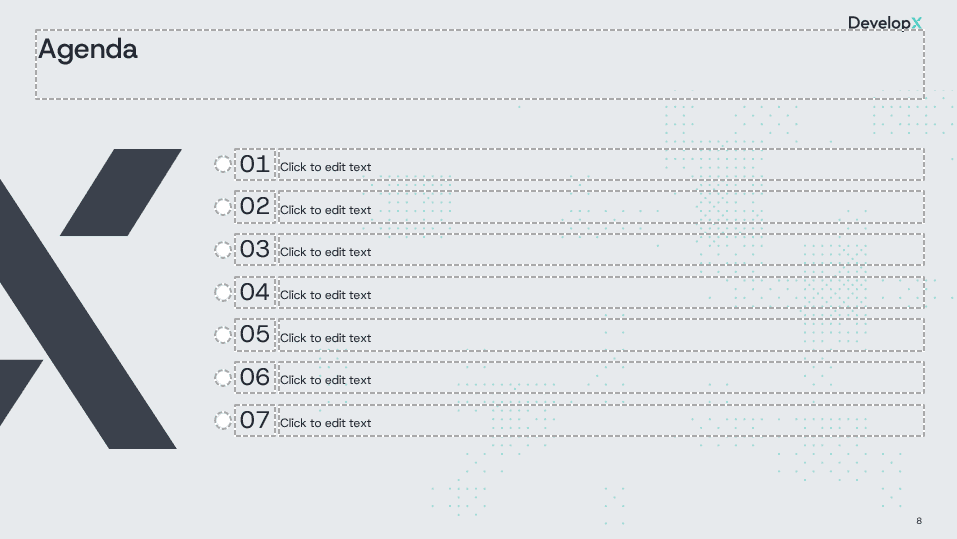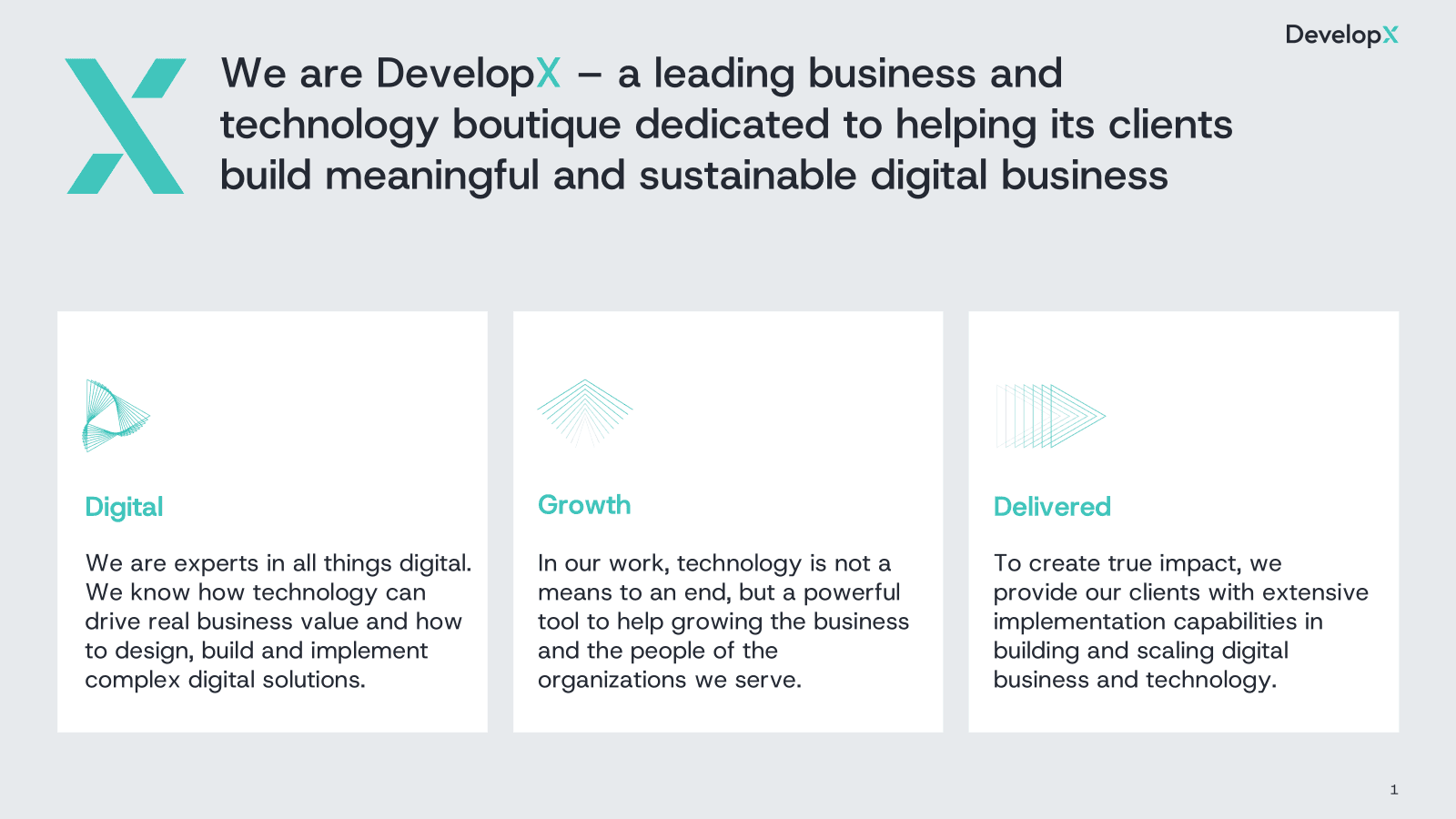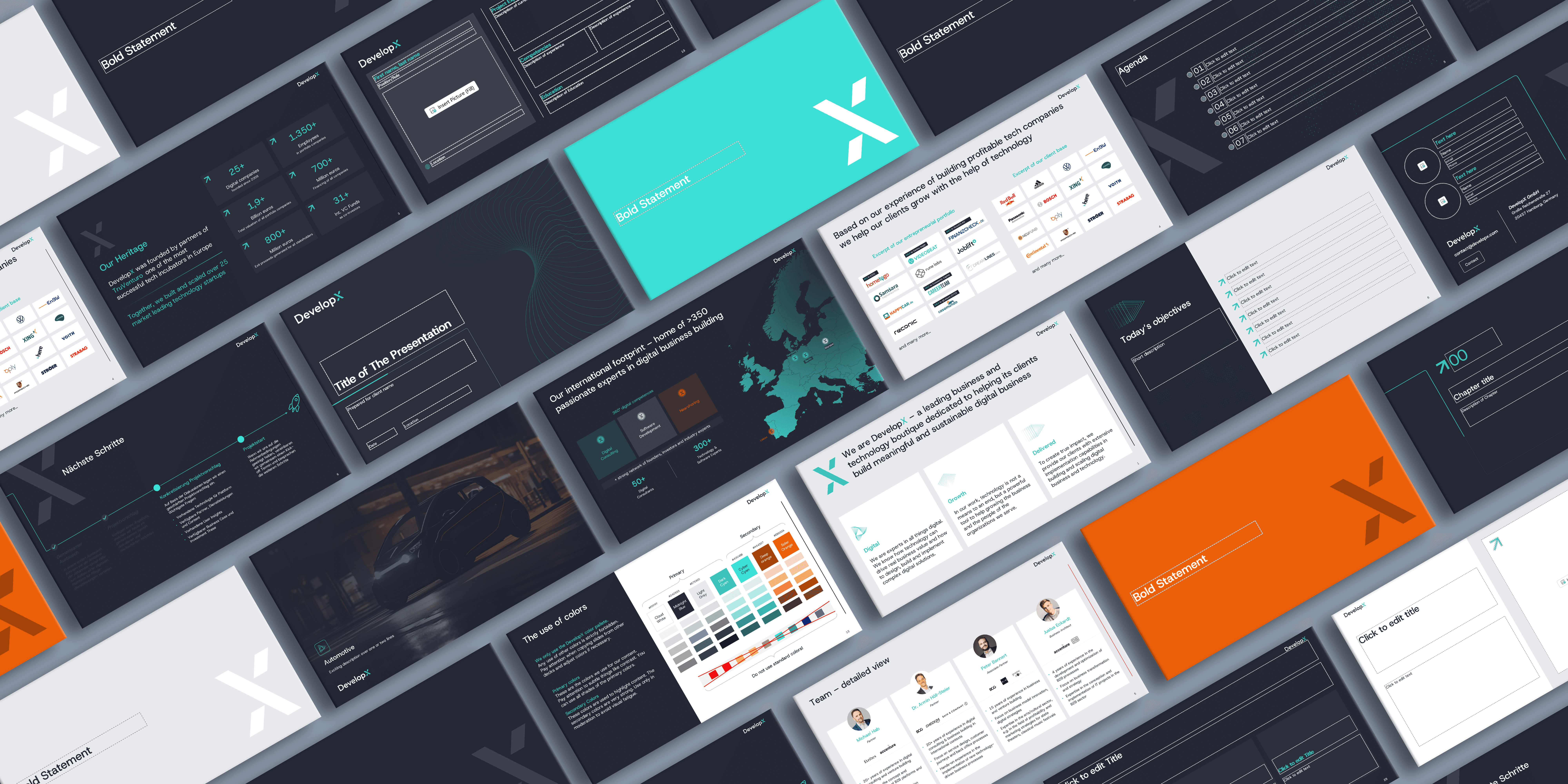 DevelopX is a leading digital strategy consulting firm with a strong track record of building successful digital businesses and products. In their daily work, they rely heavily on PowerPoint to structure, visualize, and present their ideas. They needed a fully functional PowerPoint Master Template with various layouts to support their daily work, standardize slide creation, and maintain high graphic quality.