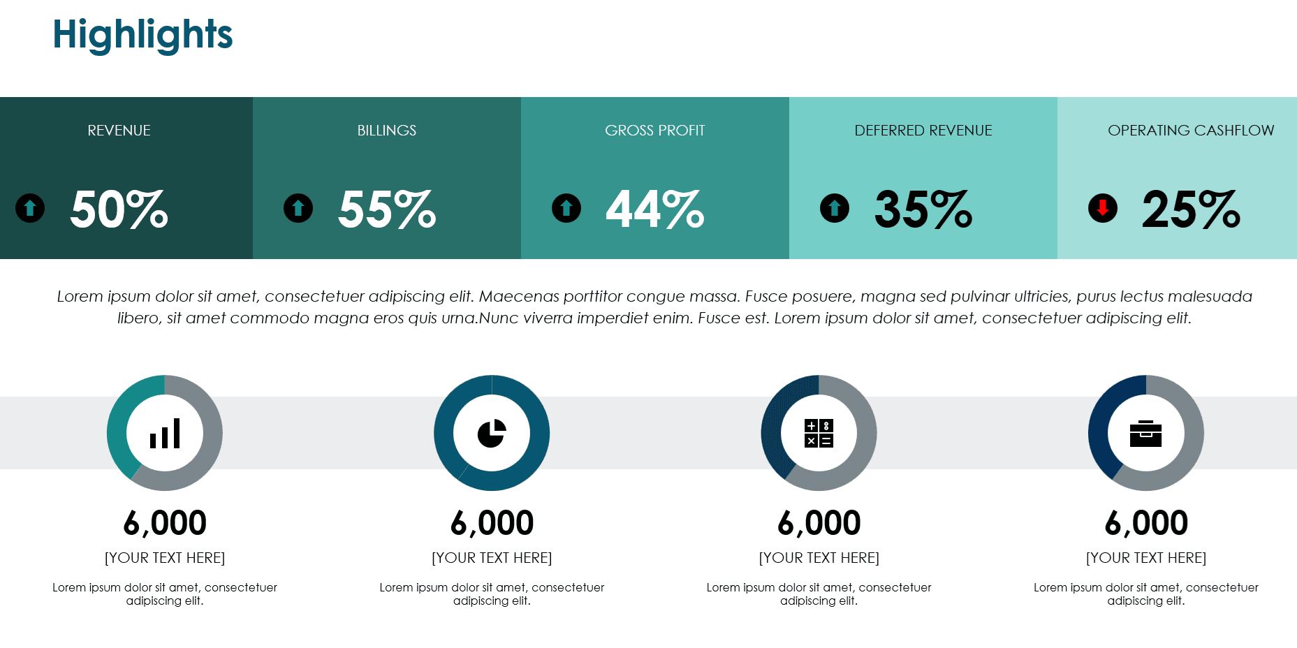 Die Financial Reporting Vorlagen enthalten ausserdem Folientypen, die sich für regionale und zeitliche Aufschlüsselungen eignen, mit denen ihr die Leistung von Märkten, Geschäftsbereichen oder Zeiträumen vergleichen könnt. Die KPI- und Kennzahlen-Folien bieten einen strukturierten Rahmen zur Darstellung von Finanzindikatoren, ohne die Übersichtlichkeit zu verlieren. Der klare visuelle Stil, die einheitliche Typografie und die gut organisierten Layouts stellen sicher, dass die Financial Reporting Vorlagen auch langfristig ein verlässliches Werkzeug für eure regelmässige Finanzkommunikation sind.